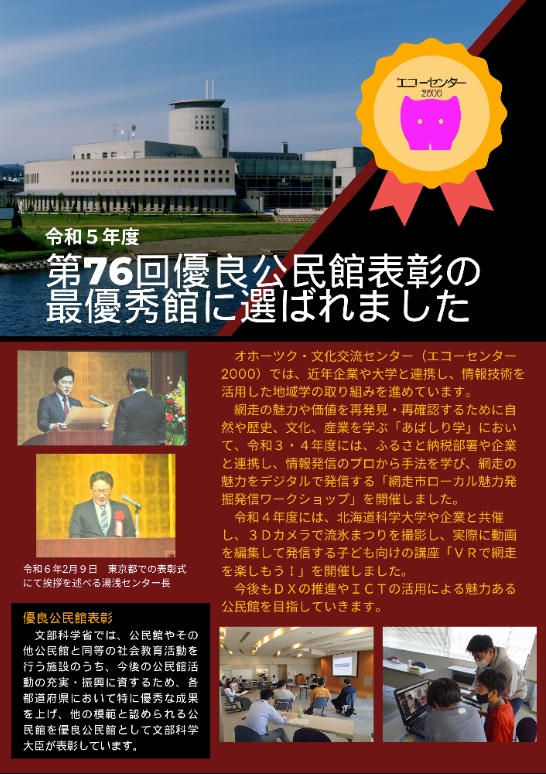 合同会社イーストタイムズは、2021年度および2022年度にわたり、オホーツク・文化交流センター(エコーセンター2000)で、網走市・網走市教育委員会および株式会社JTBふるさと開発事業部と共に、「網走市ローカル魅力発掘発信ワークショップ」を実施しました。この情報技術を活用した地域学の取り組みが高く評価され、このたび、オホーツク・文化交流センターが、全国約17,000館の公民館から、第76回優良公民館表彰で最優秀館に選出され、文部科学大臣表彰を受賞しました。